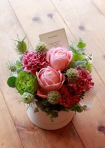 生花アレンジメントはお手頃サイズ。