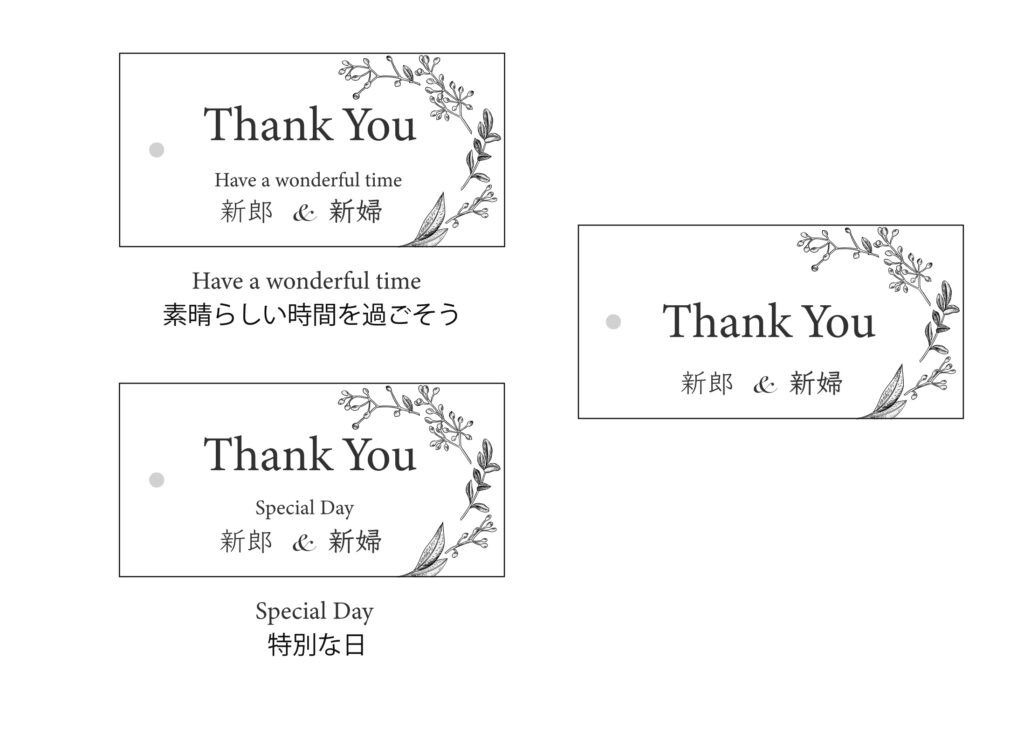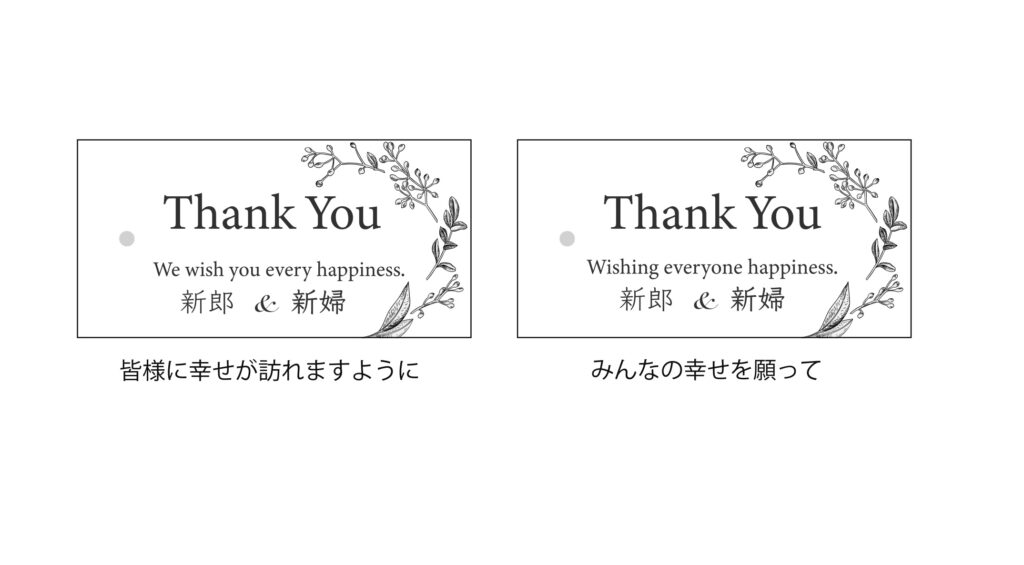 こちらは、挙式、披露宴後のゲストお見送りの際に渡すプチギフト用のタグとしておすすめしたい文言です。
